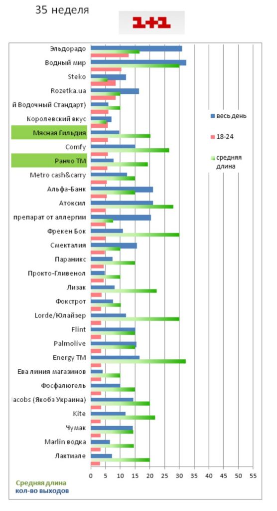 Охват 50% аудитории еженедельно, за флайт 80% на частоте 1+, и 65% на частоте 3+.