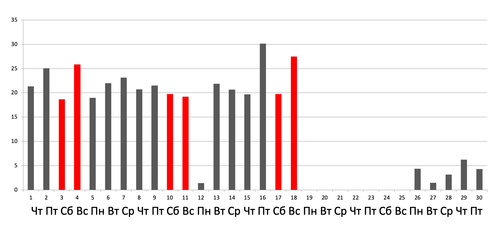- Перерыв в размещении на 1-2 дня никак не влияет на активность заходов. Т. е. эффект рекламы сохраняется. И только после 3го дня видим падение обращений (22-25 сентября).
